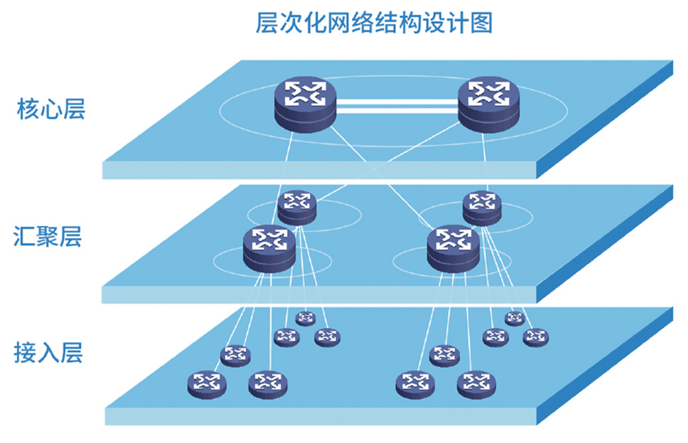 针对区域级电力调度数据网的网络规划,进行三层网络结构设计,即核心层、汇聚层、接入层。核心层为网络业务的交汇中心,通常情况下核心层只完成数据交换功能;汇聚层位于核心层和接入层之间,主要完成业务的汇聚和分发;接入层主要将用户业务接入网络,实现质量保证和访问控制。