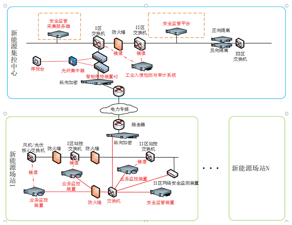 (1)新能源场站侧:实现场站内资产、流量、业务等信息的采集和集中管控,上送到集控中心。业务监控系统实现实时业务监控,实时分析网络中的业务数据,网络流量以及业务运行状况;包括自动发电控制(AGC)、自动电压控制(AVC)、风功率和光功率预测等通信情况。以及测控、保护、相量测量单元(PMU)、电量、故障录波、保信子站、风机运行状态等业务运行情况。